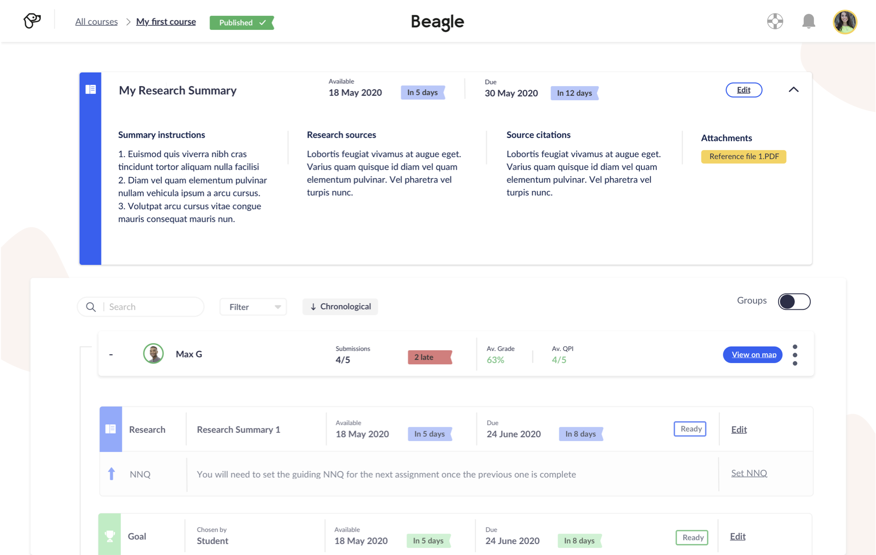 We were brought on to help Beagle become a product-led startup and to design the next iteration of their learning management platform – taking it from a functional MVP to an intuitive and flexible standalone web app for instructors and students to complete entire academic courses.