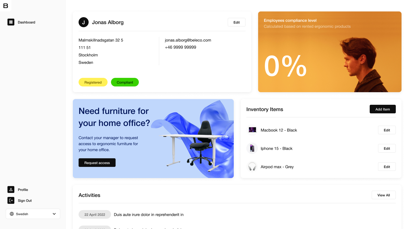 Beleco is a subscription furntiure company, who focuses on renting out sustainably made designer furniture, for offices and event spaces. Their focus on circular economy and helping companies reduce their carbon impact, as well as their unique business model, makes them an exciting player in Stockholm’s tech start-up scene.